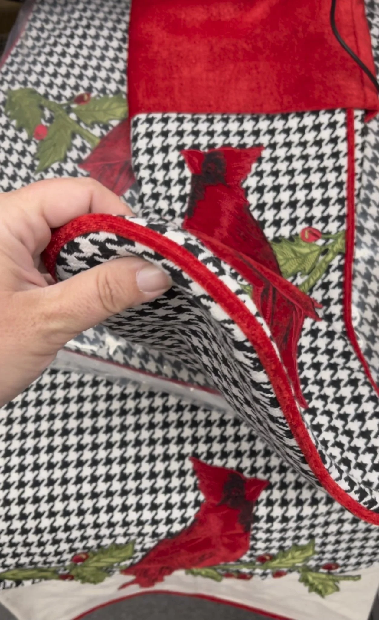 Gorgeous Christmas red bird on houndstooth stocking with red velvet trim.