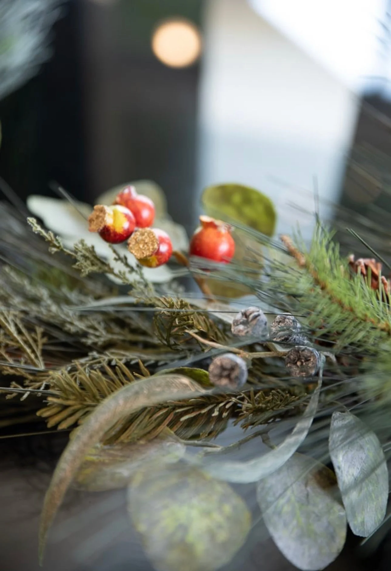 Long needle white pine, eucalyptus,berries, and pinecone garland